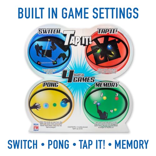 Tap It is the new fast-paced, interconnected wireless pod game with 4 games in one: (1) Tap It: Each player is assigned a color and whoever is able to tap their color the most in 60 seconds wins! (2) Pong: 2 players place their pods in a straight line and take turns sending the light back and forth, hoping the other player misses. (3) Switch: Players place pods all over their room or backyard and then race to their color before the color switches! Whoever gets to their color the most wins. (4) Memory: Players take turns trying to match the pattern sequence. Whoever can follow the longest pattern wins. Great for multiple players: up to 8! Connect up to 24 pods to grow your game to the next level. Includes 4 wireless pods and instructions. Recommended for ages 6 and up.