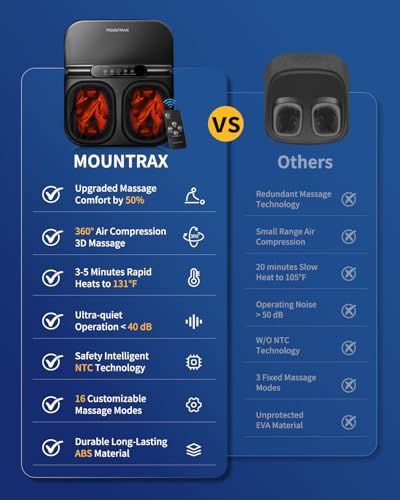 MOUNTRAX Foot Massager with Heat – Features dual independent rolling heads and 6 groups of ergonomic nodes that precisely target reflex areas (arch, heel, and forefoot), delivering deep tissue pain relief for plantar fasciitis and neuropathy. 15-30 min/day to improve circulation and enhance foot health