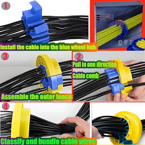 2,Easy and simple operation: This wire comb features a straightforward process: place the cable at the starting end, align with the blue center wheel, clamp the yellow ring, and pull. As an efficient cable management tool, it simplifies bundling and reduces difficulty, easily integrating into networking tools.