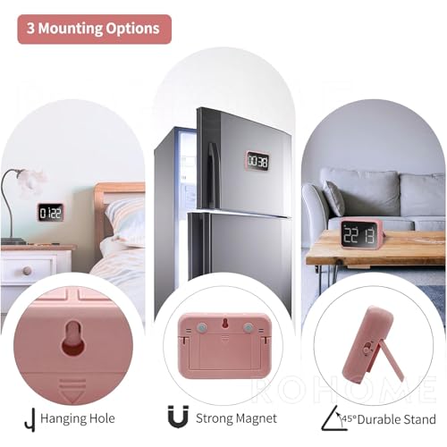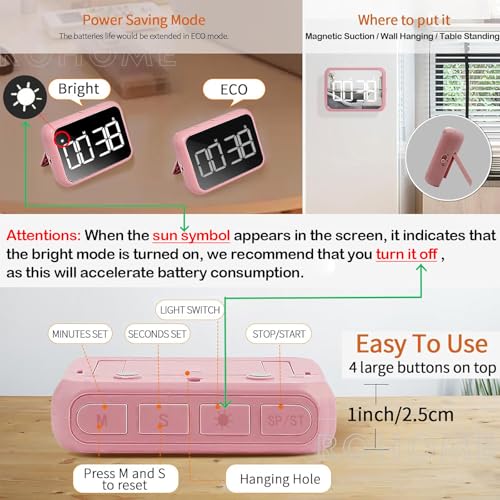 Digital LED Timer Stopwatch with Mirror Screen, Visual Count Down & up Timers for Kitchen Cooking, Magnetic Suction/Wall Hanging/Stand on Table, Easy for Kids, Night Light, Loud or Silent (Pink)